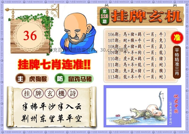 ◎六合不出:鸡蛇羊;三合不出:兔虎马;应开生肖:猴蛇猪鼠羊。防:马鸡